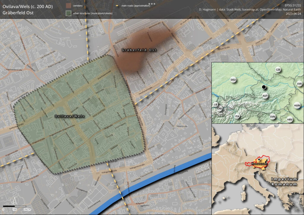 Ovilava/Wels (ca. 200 n.Chr.) und Gräber­feld Ost. Grafik: D. Hamann, data: Stadt Wels; basemap.at; OpenStreetMap; Natural Earth